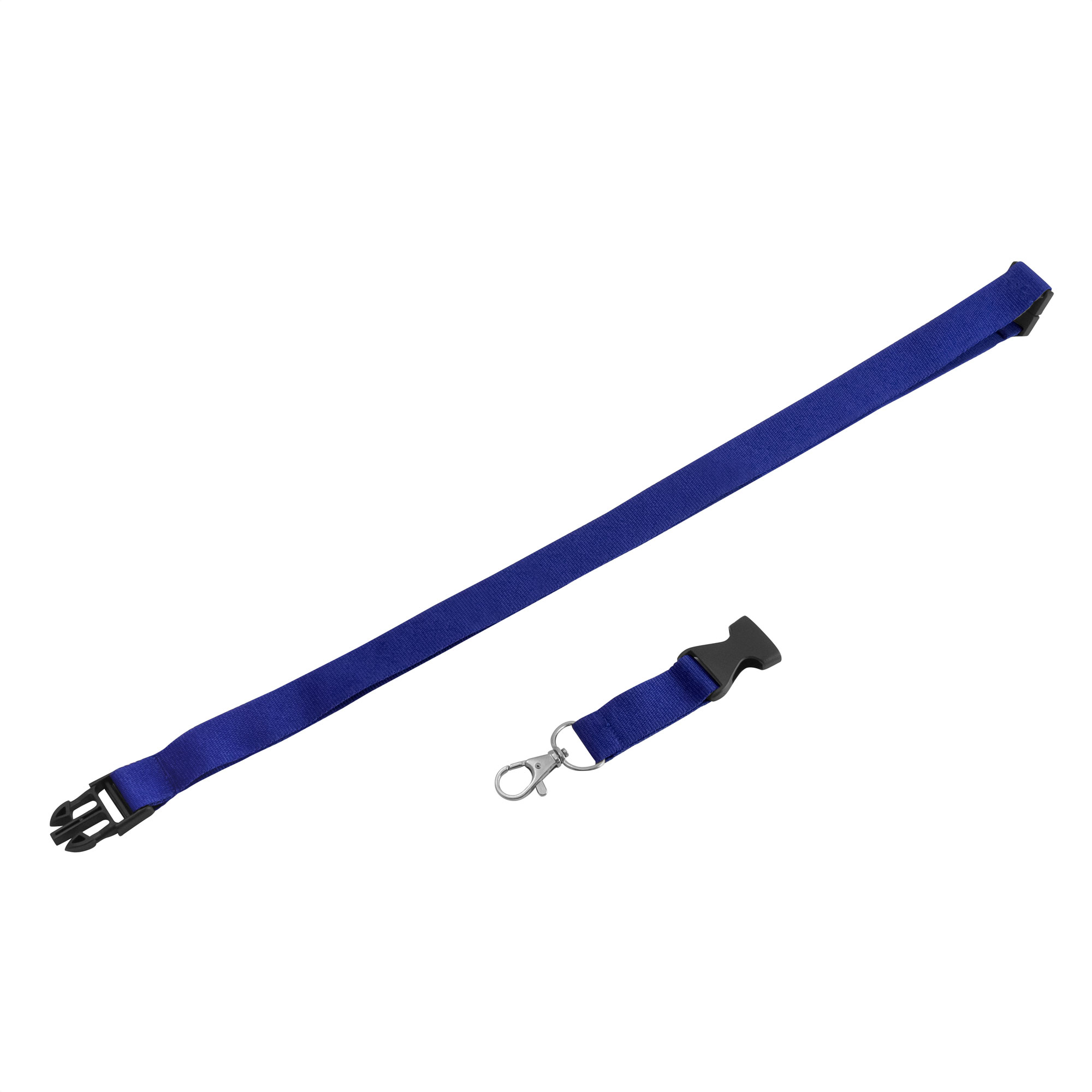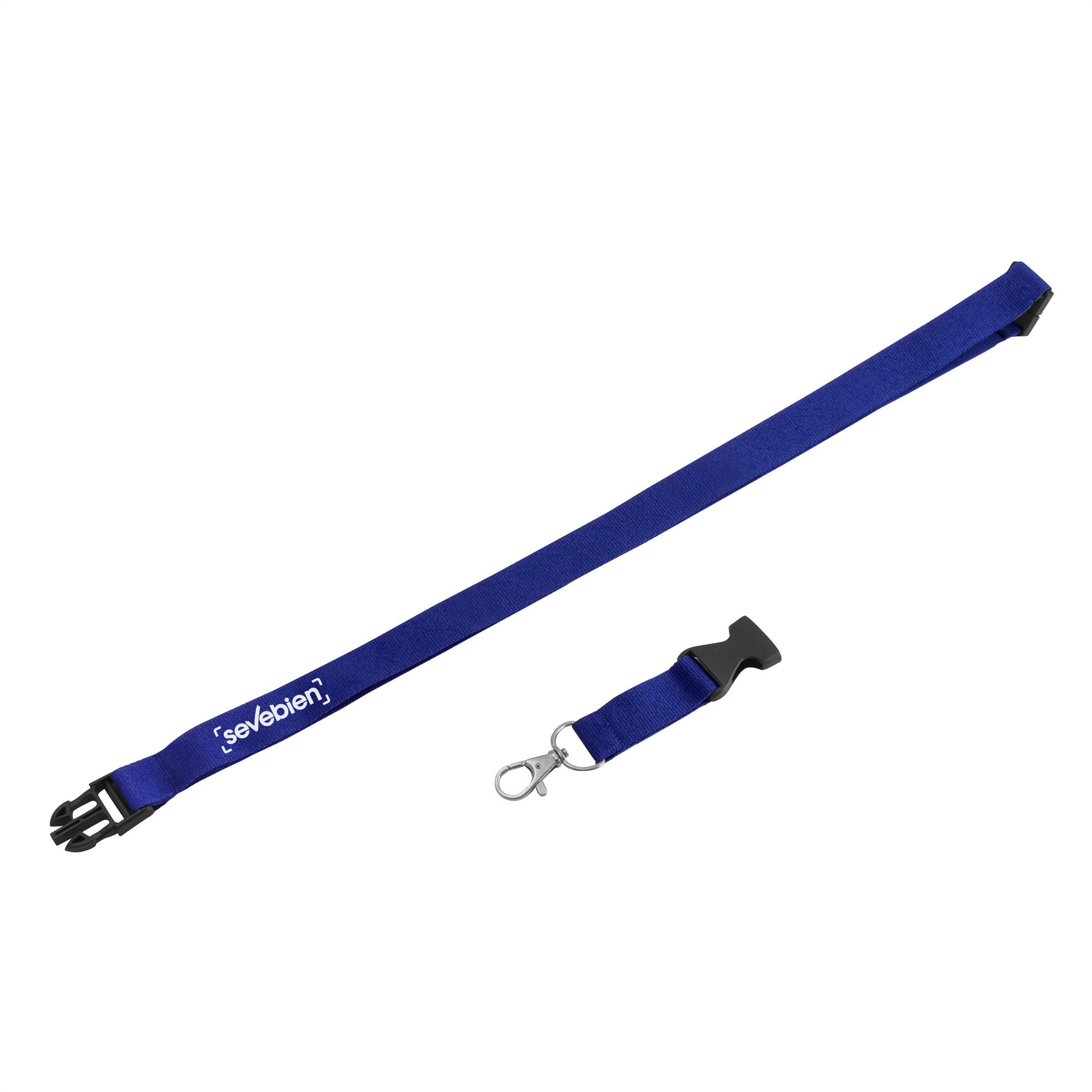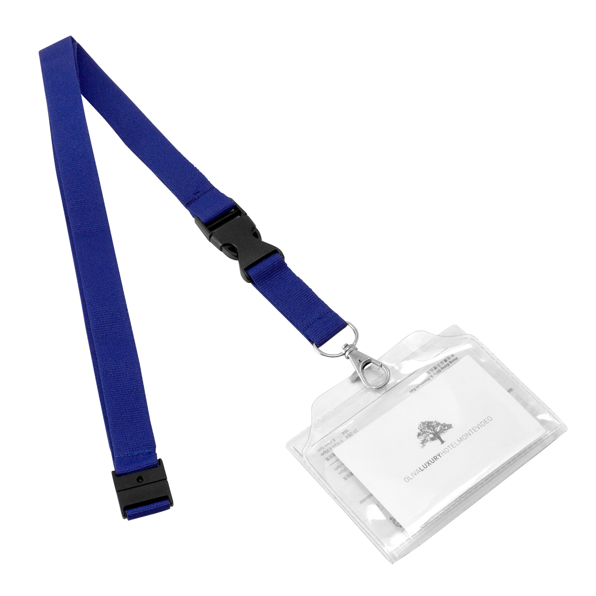 57 cm de largo x 2 cm de ancho. Poliester + PP + metal. Porta gafete. Hebilla de seguridad desmontable plástica y mosquetón de metal giratorio.