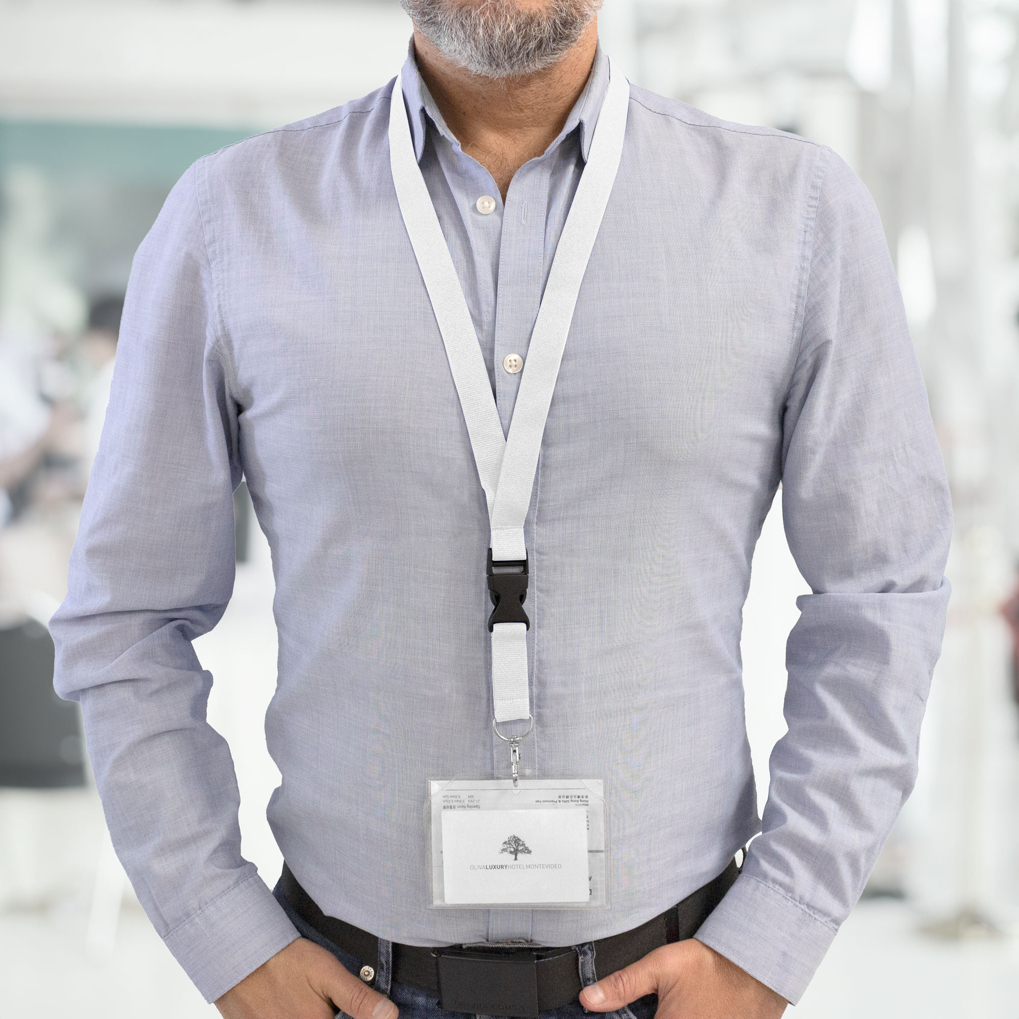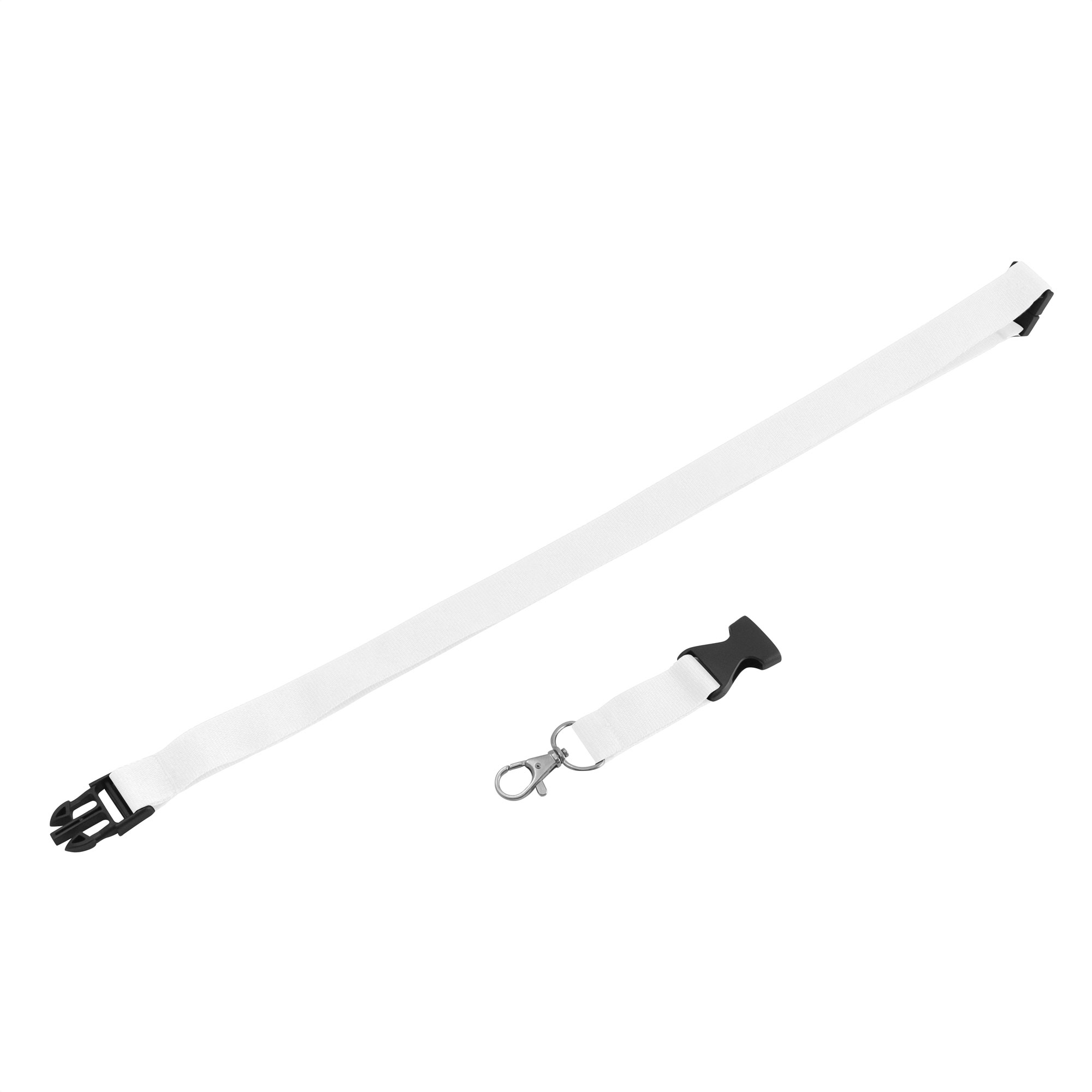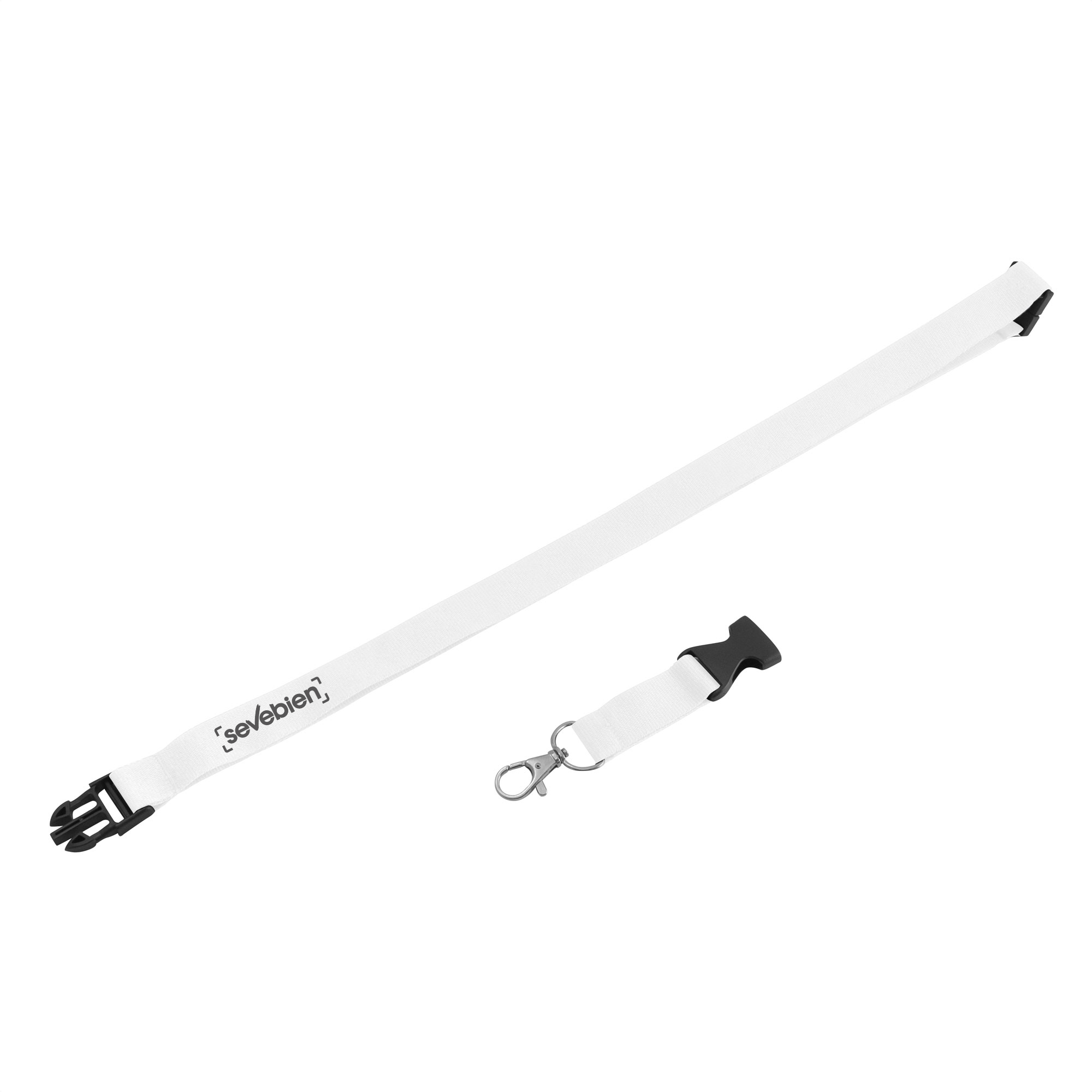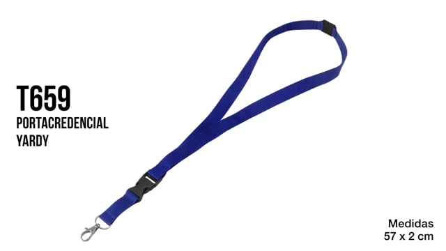 57 cm de largo x 2 cm de ancho. Poliester + PP + metal. Porta gafete. Hebilla de seguridad desmontable plástica y mosquetón de metal giratorio.