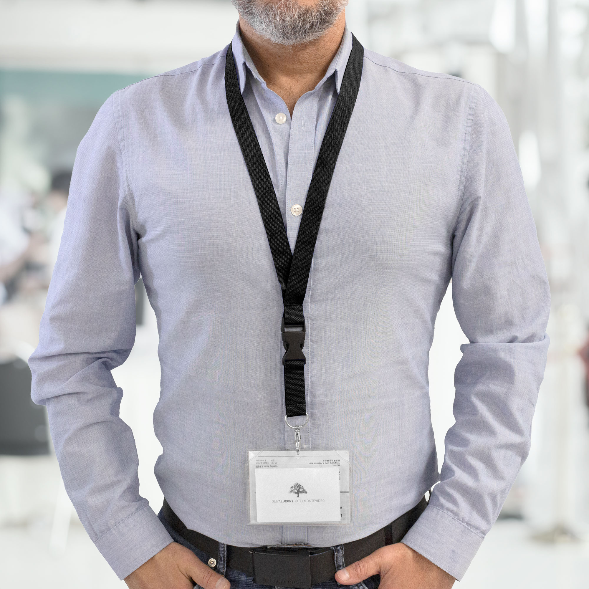 57 cm de largo x 2 cm de ancho. Poliester + PP + metal. Porta gafete. Hebilla de seguridad desmontable plástica y mosquetón de metal giratorio.