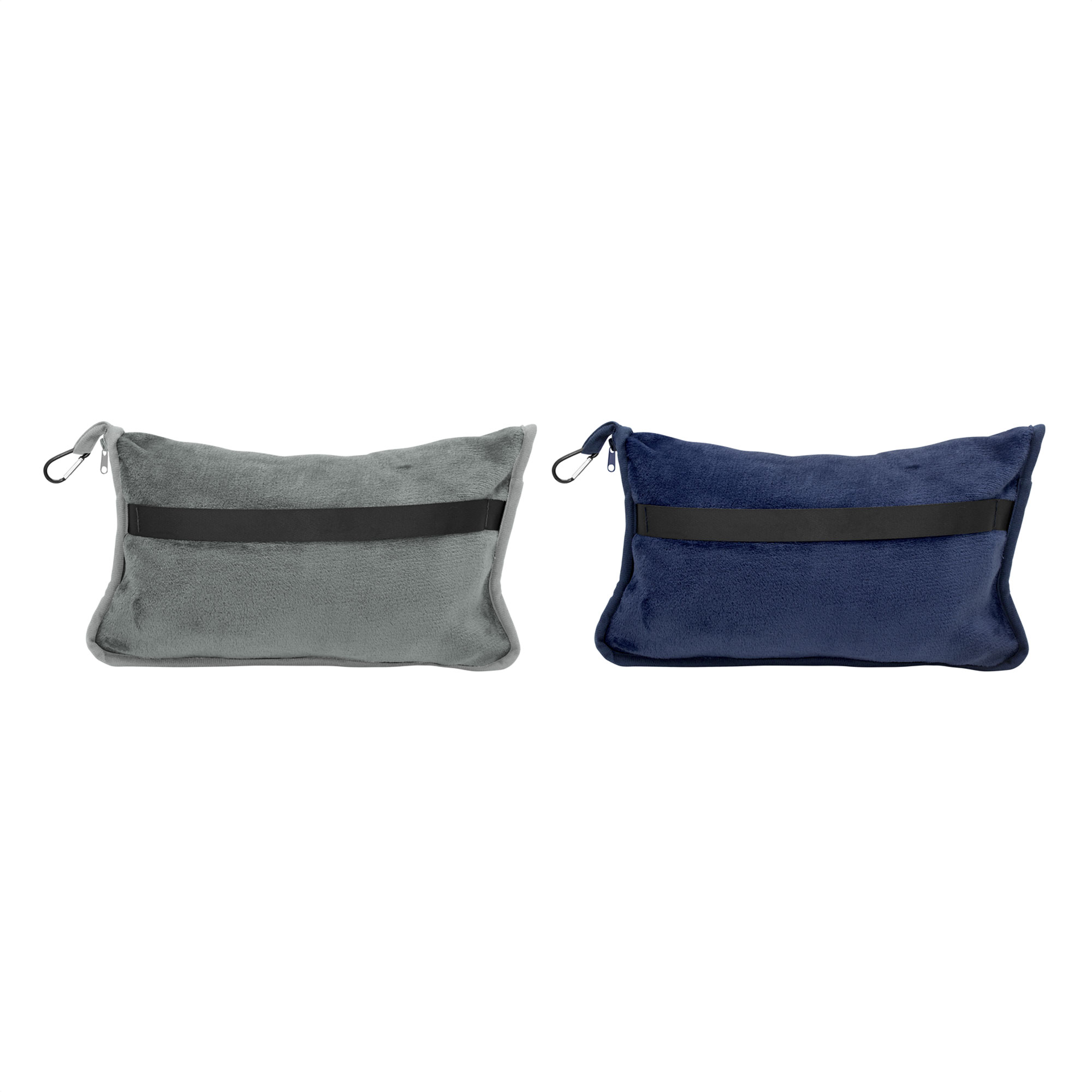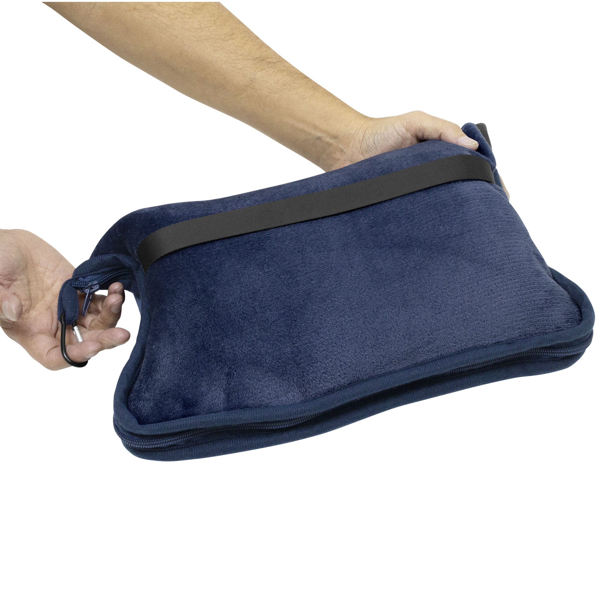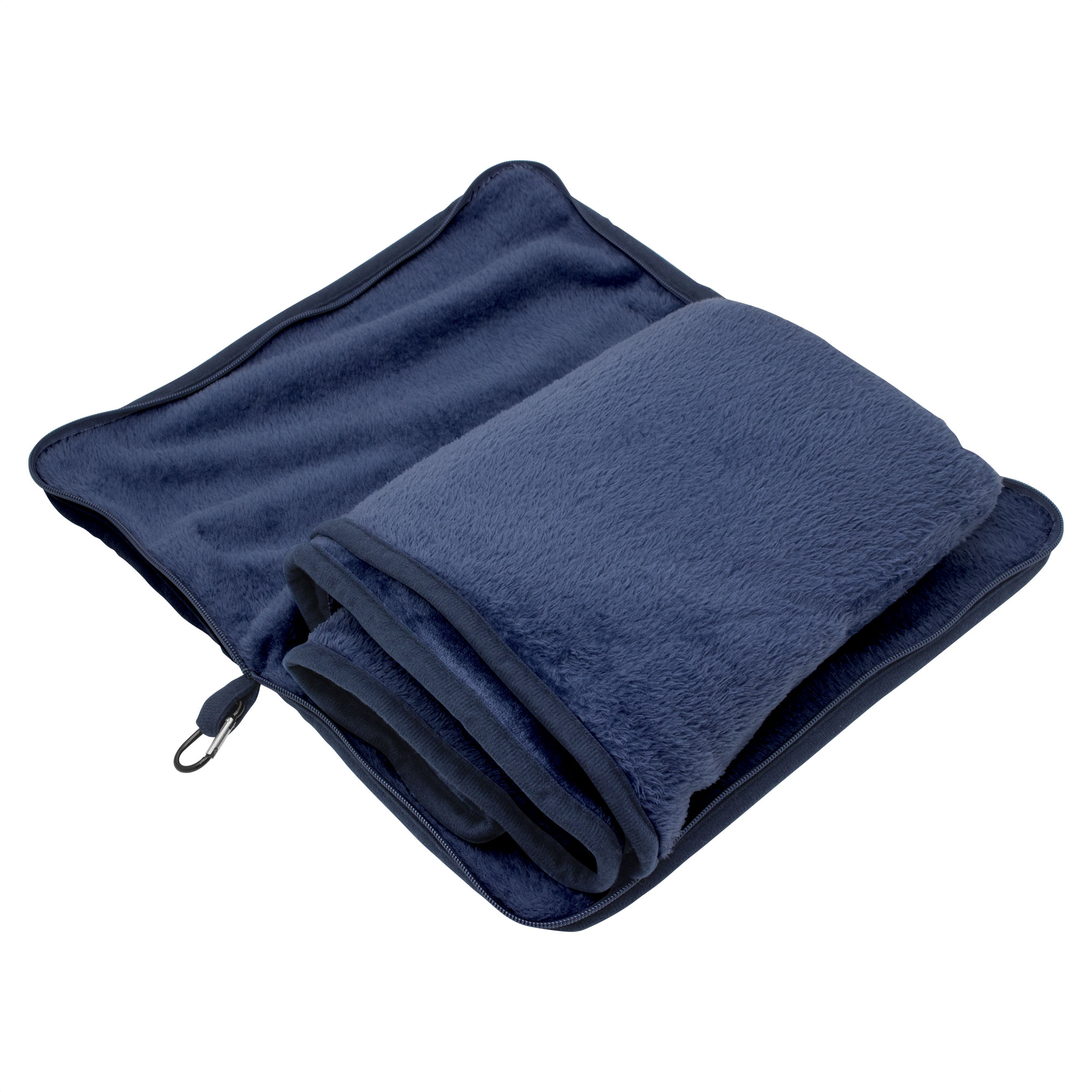 Manta y almohada de viaje compacta 2 en 1. Manta de polar de alta calidad con textura aterciopelada al tacto. Doble felpa, de pelo corto y largo. Funda con cierre del mismo material, con mosquetón para colgar en mochila y tira para sujetar la mochila en la manija extensible de un equipaje de mano. Cuando la manta está plegada y dentro de la funda se puede utilizar como almohada.